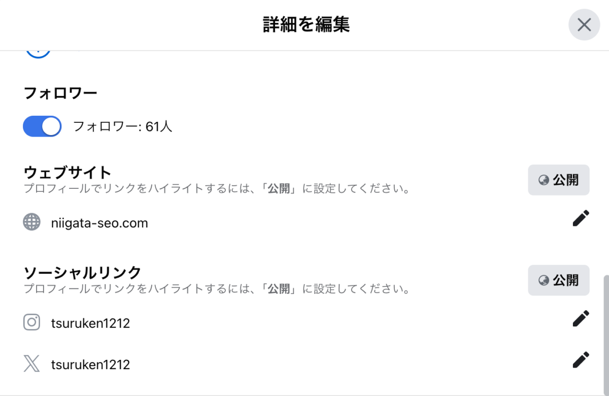 すると自己紹介の編集メニューが開きます。メニューをスクロールすると「ウェブサイト」という項目があるので、これを選択。ブログのURLを入力すれば連携が完了します。