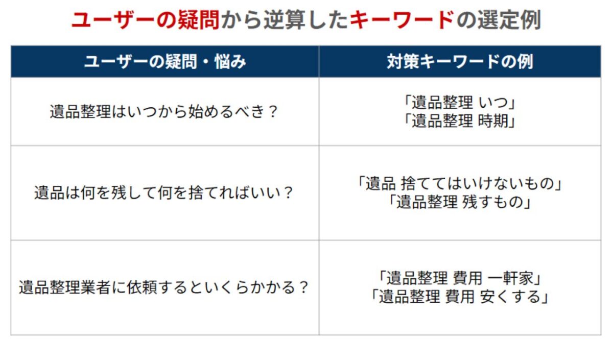 ユーザーの疑問・悩みの解決に役立つ有益な情報を提供することで、SEO評価の向上を狙えます。遺品整理を検討しているユーザーが抱えがちな疑問や悩みを起点として、以下のように対策キーワードを選定してみましょう。