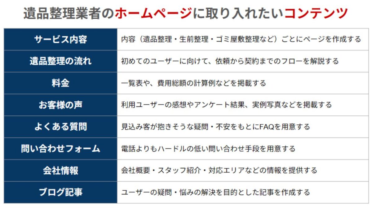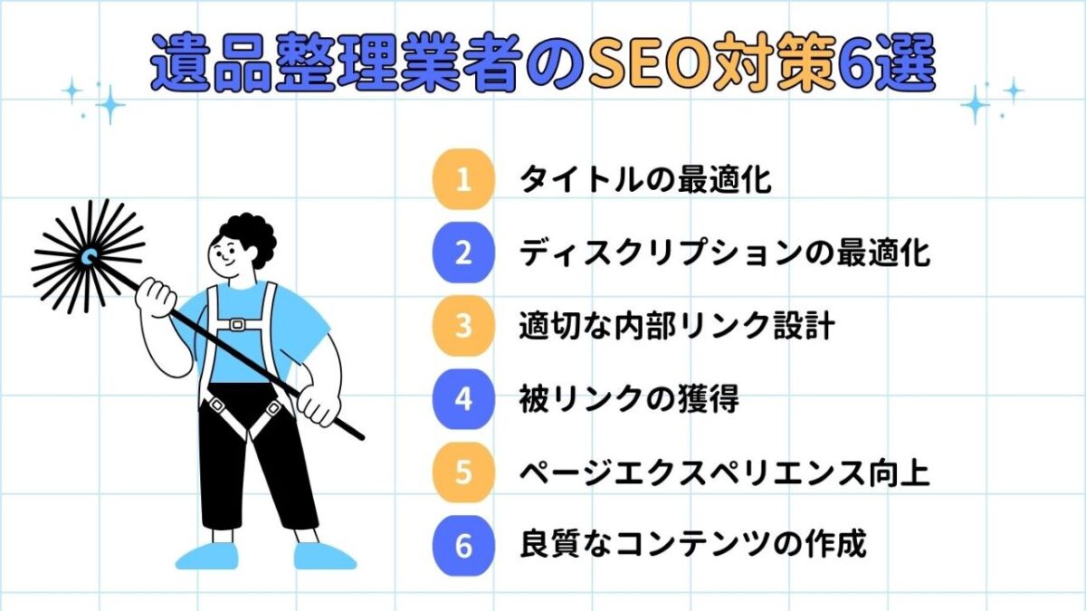 遺品整理業のSEOにおいて、とくに重要な施策は以下の6つです。