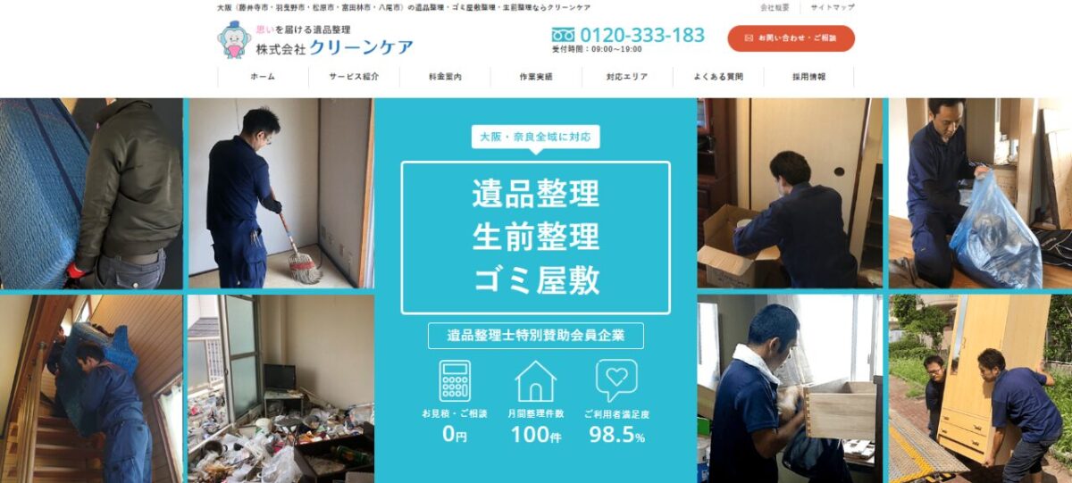 株式会社クリーンケアは、大阪を中心とした関西エリアに幅広く対応する遺品整理業者です。市区町村ワードや、依頼者の悩みに関連する多くのキーワードを対策し、地域における存在感を放っています。