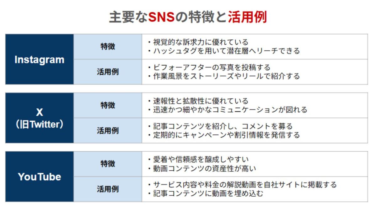 主要なSNSの特徴・メリットと、効果的な活用例を以下にまとめました。