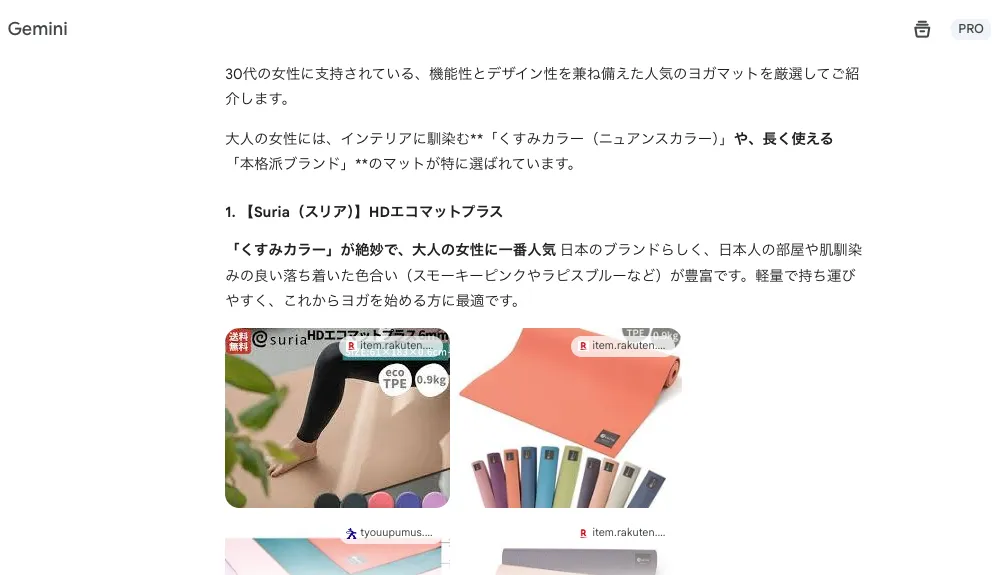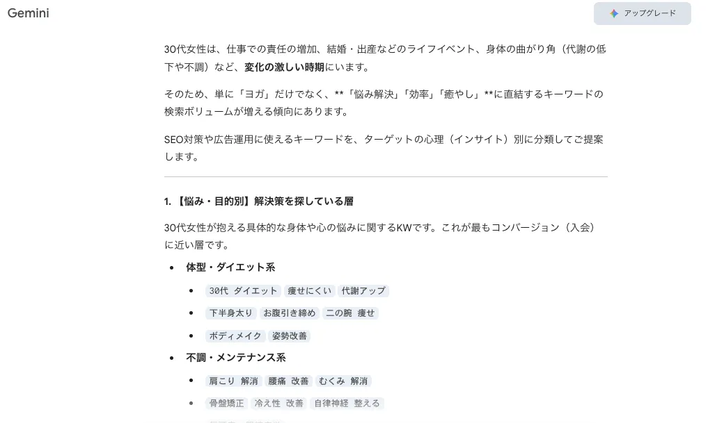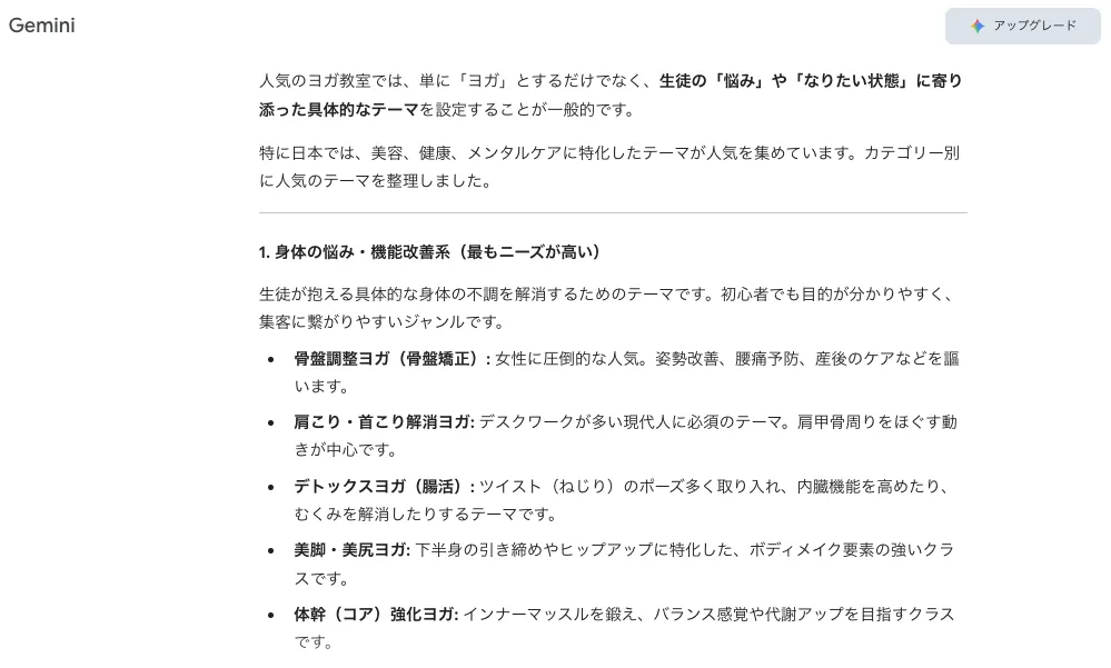 ヨガ教室のテーマをGeminiで調べてみると、身体の悩み・機能改善系やリラックス・メンタルケア系などヨガの目的別に豊富なテーマが表示されます。