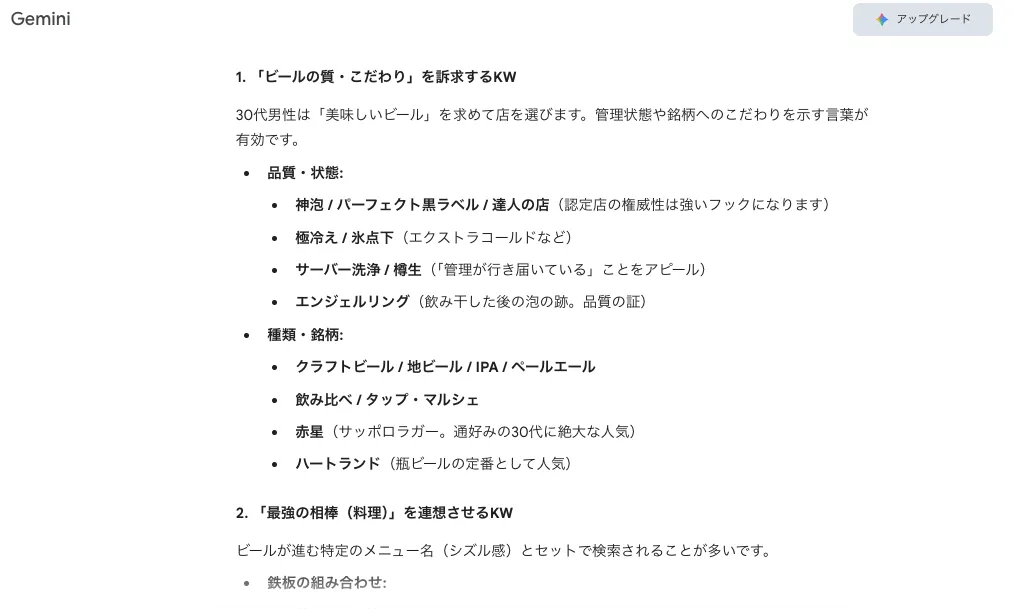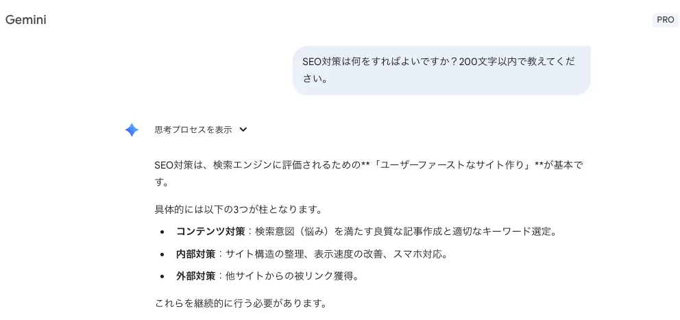 たとえば、ターゲットがよく分からないときは、Geminiは自社の商品・サービスを見直すことを提案しています。上記は回答の一部ですが、SEOに取り組むヒントになります。「うちの商品やサービスの価値っていったい何なの?」「ユーザーは何を気にいってるの?」と振り返って、強みを探ってみましょう。