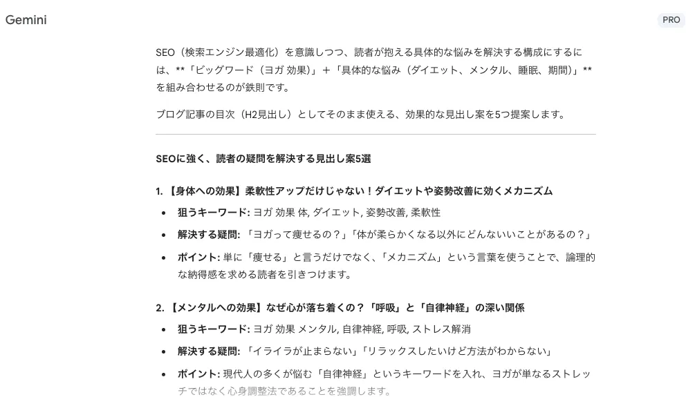 例:「ヨガが心と体に与える効果」というテーマで見出し案を求める場合