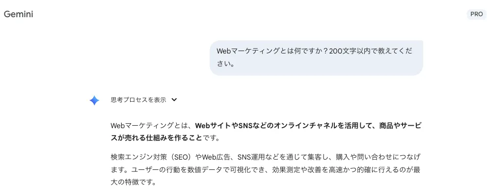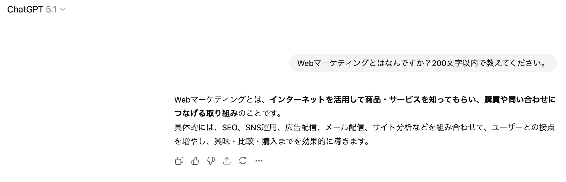 回答結果を比べると、両方とも、大まかには同じ内容で「Webマーケティングはインターネットを活用して、顧客獲得・販売促進を行うこと」とあります。Geminiは、戦略的な視点で全体像を捉えた説明スタイル、ChatGPTは具体的な手法をあげて、技術的な側面を重視した実務的な説明スタイルでした。