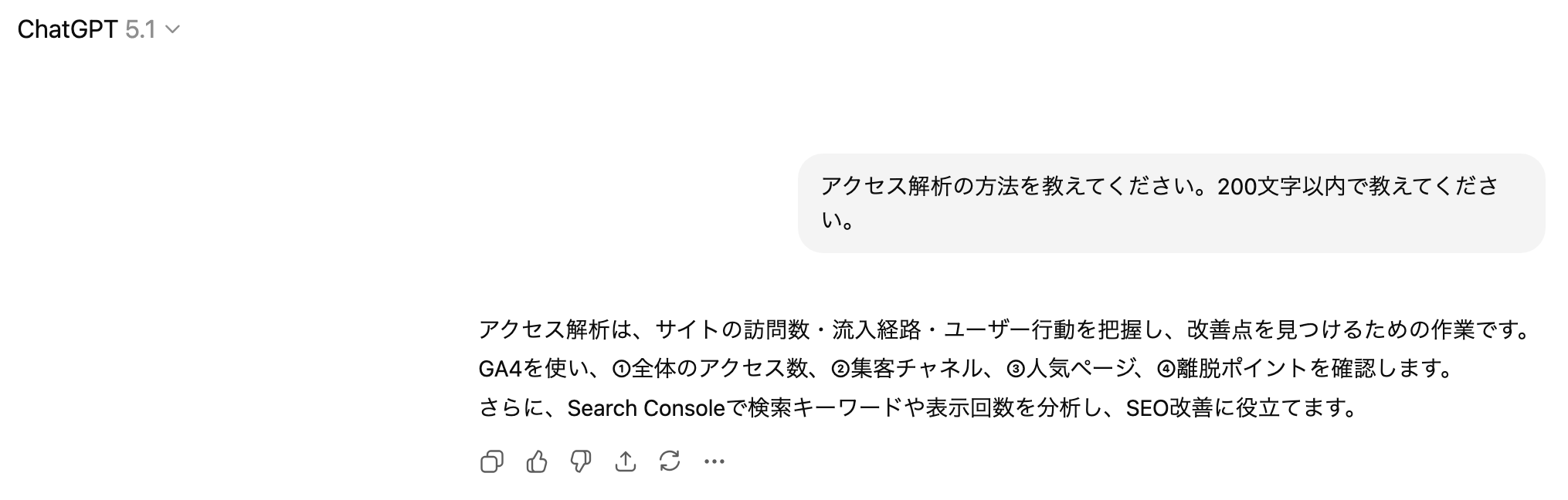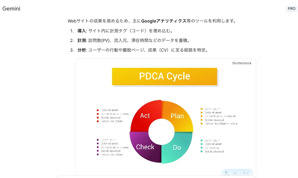 Geminiは具体的なツール名を強調し、導入・計測・分析に分類して、図解を使ってアクセス解析のプロセスを丁寧に説明しています。ChatGPTは分析に必要な項目を列挙し、実務で使える具体的な指標や機能を効率的に紹介してくれました。