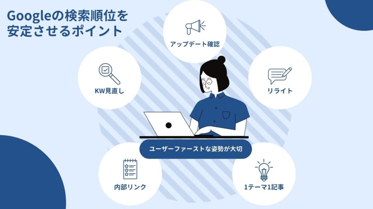 ユーザーファースト(読者第一)を意識したうえで、次のポイントを意識することで検索順位が安定しやすくなります。