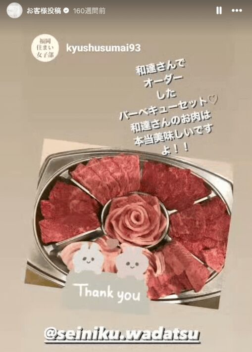たとえば、福岡市の精肉店である「精肉店和達WADATSU」は、フォロワー1.5万人のInstagramアカウントを運用しています。ストーリーズで利用者の口コミを紹介するなど、顧客と双方向のコミュニケーションを実現している点が特徴です。