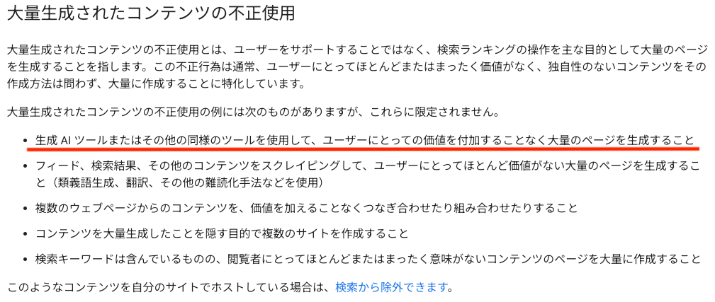 AIによる低品質な記事の増加に伴い、Googleはスパムに関するポリシーに以下の項目を追加しています。
