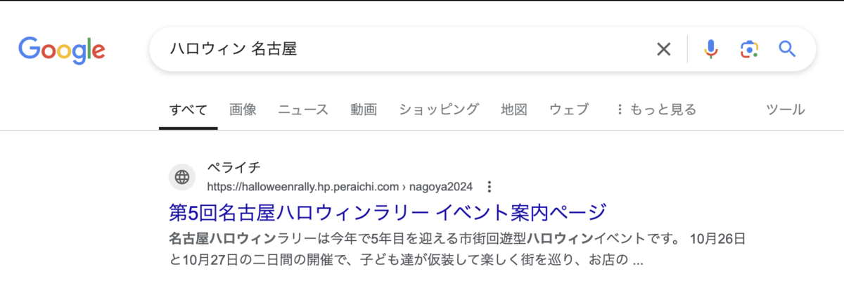 イベント系のキーワードで検索すると、ペライチが上位表示されていることがあります。例えば「ハロウィン 名古屋」で検索すると一番上にペライチで作ったイベント告知が表示されます(2024年10月現在)。