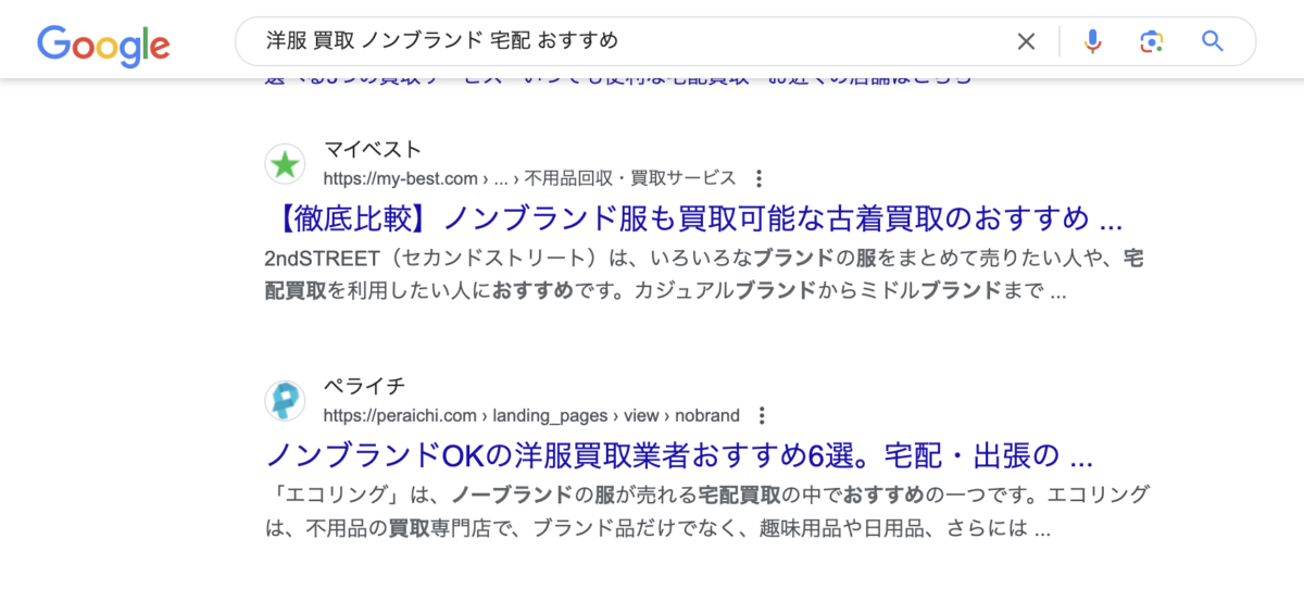 例えば「洋服 買取 ノンブランド 宅配 おすすめ」、「害獣 駆除 業者」などのキーワードで検索するとペライチのサイトが上位表示されています。