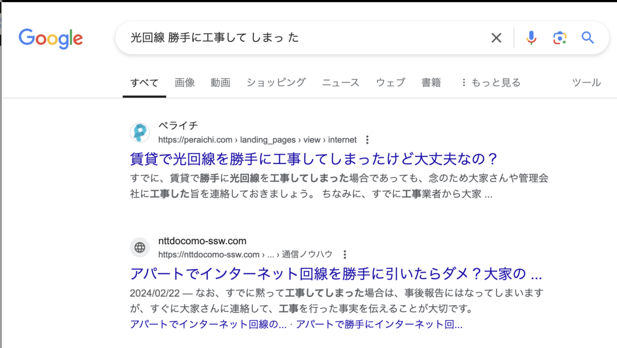 ノウハウやハウツーを調べるキーワードでも、ペライチのページが上位表示しています。「光回線 勝手に工事してしまった」、「トレーラーハウス 価格」などのキーワードで、ペライチが上位表示されています。