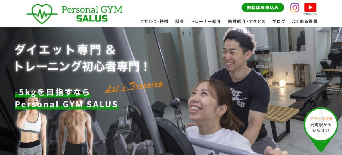 パーソナルジムサルスは、神戸を拠点とする初心者専用のジムです。地名を含むキーワードでは、大手ジムやポータルサイトに負けず上位表示を獲得しています。