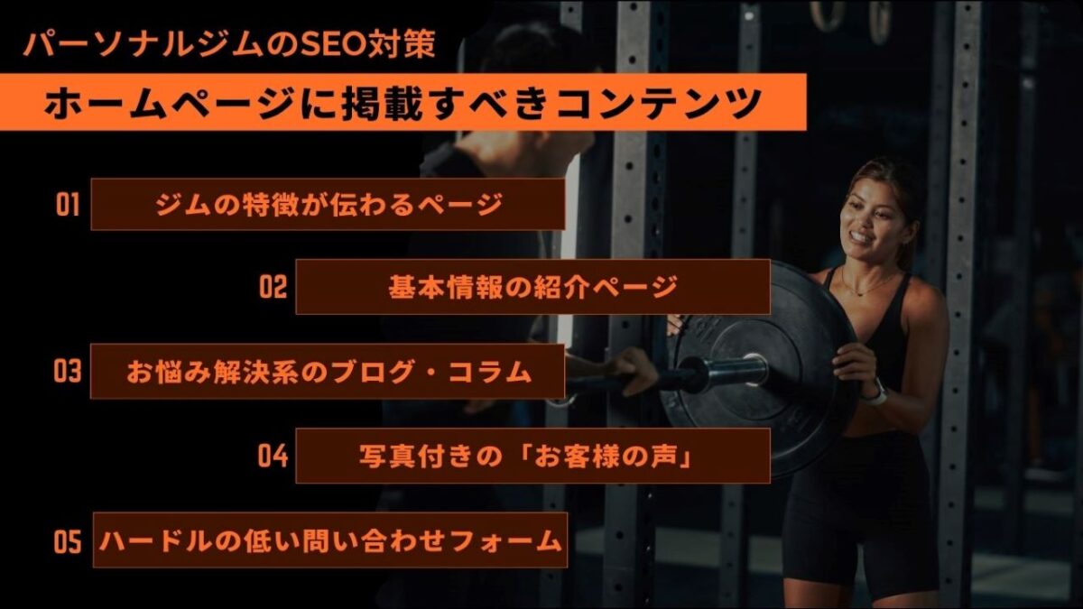 パーソナルジムのSEO対策では、ホームページのコンテンツを充実させることが不可欠です。掲載すべきコンテンツには、以下のようなものがあります。