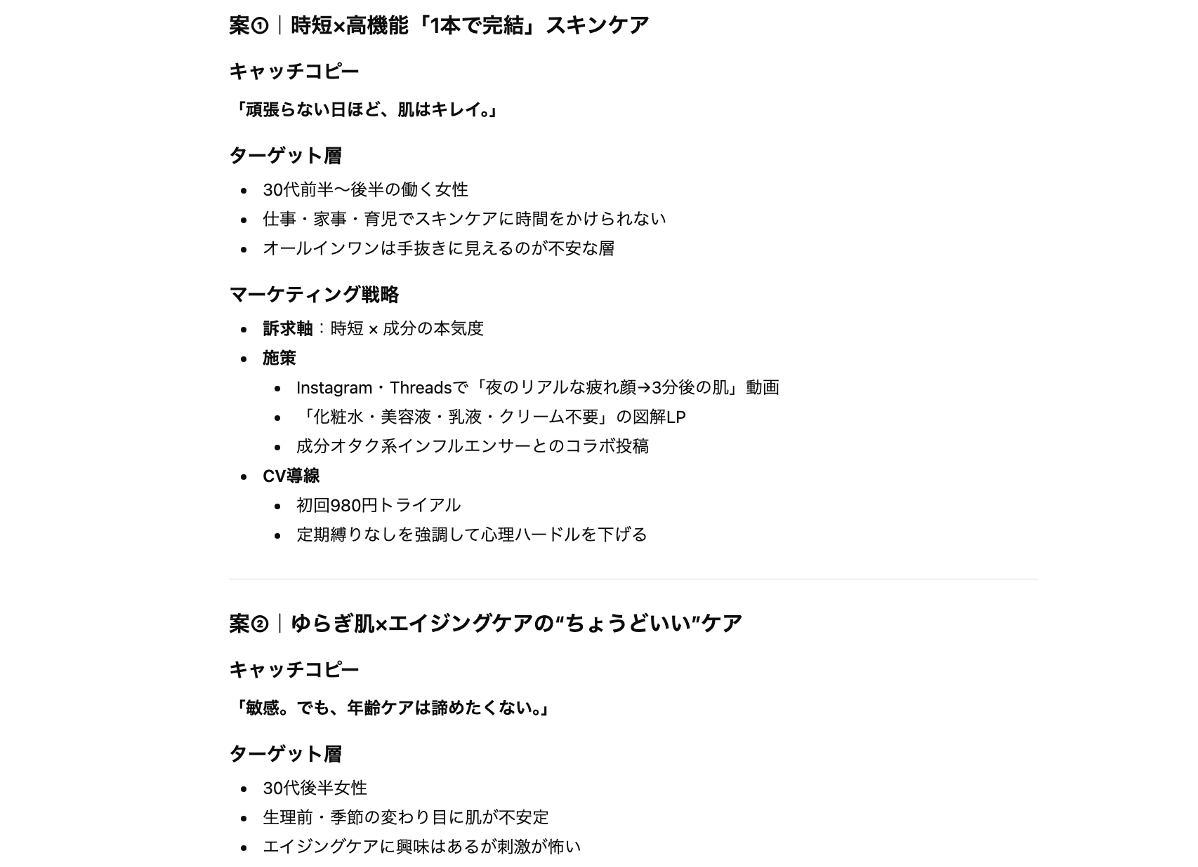 | 「スキンケア用品でよいアイデアない?」 | 「30代女性向けスキンケア用品のアイデアについて、 ・キャッチコピー ・ターゲット層 ・マーケティング戦略 をそれぞれまとめて提案して」 |