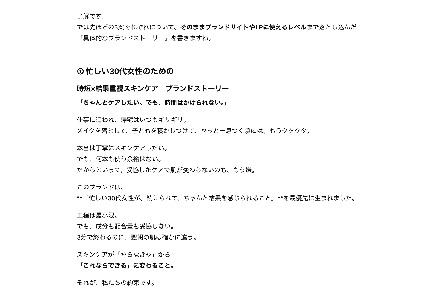先ほどChatGPTに提案された「スキンケア用品のブランドストーリー」について、「より具体的に」とフィードバックをしてみました。