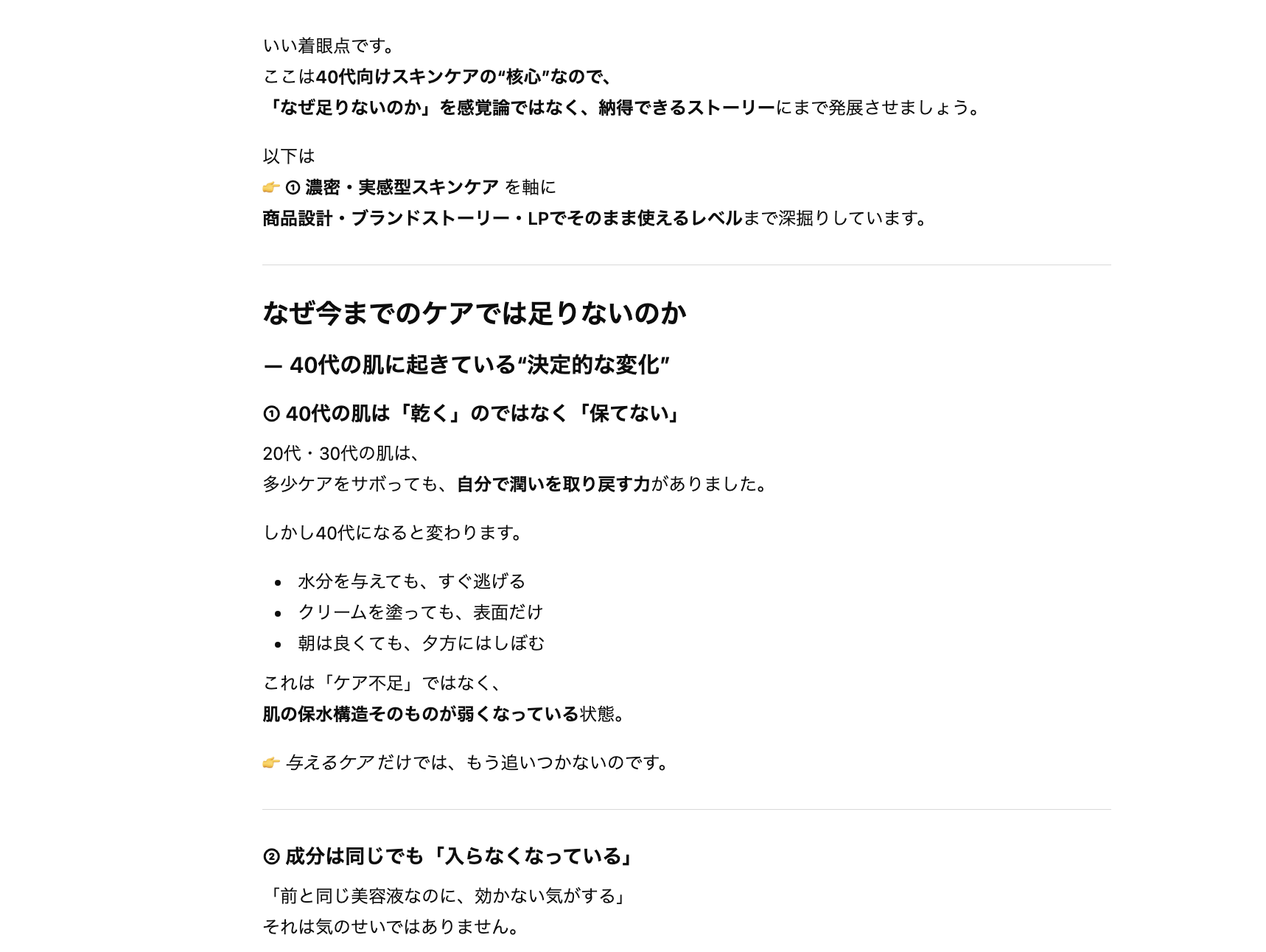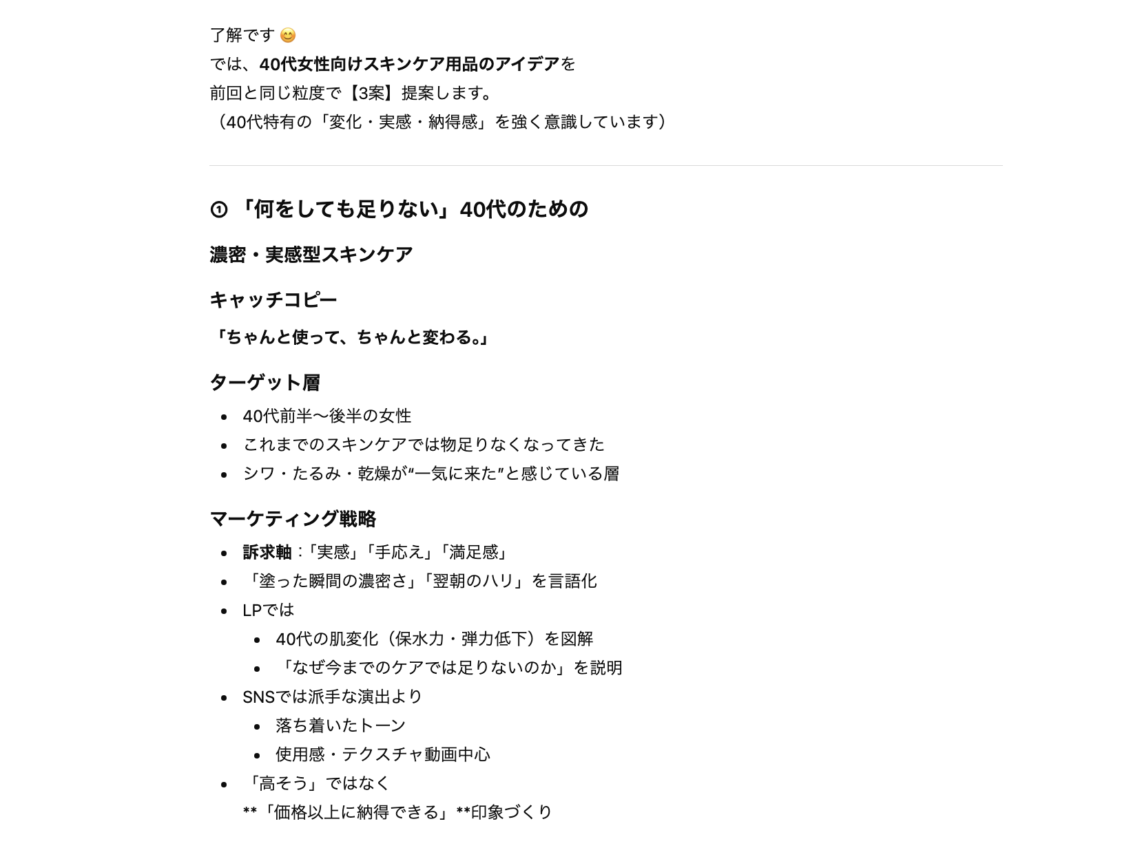 プロンプト:「過去に作成した『30代女性向けスキンケア用品のアイデア』のように、40代女性向けスキンケア用品のアイデアを提案して」
