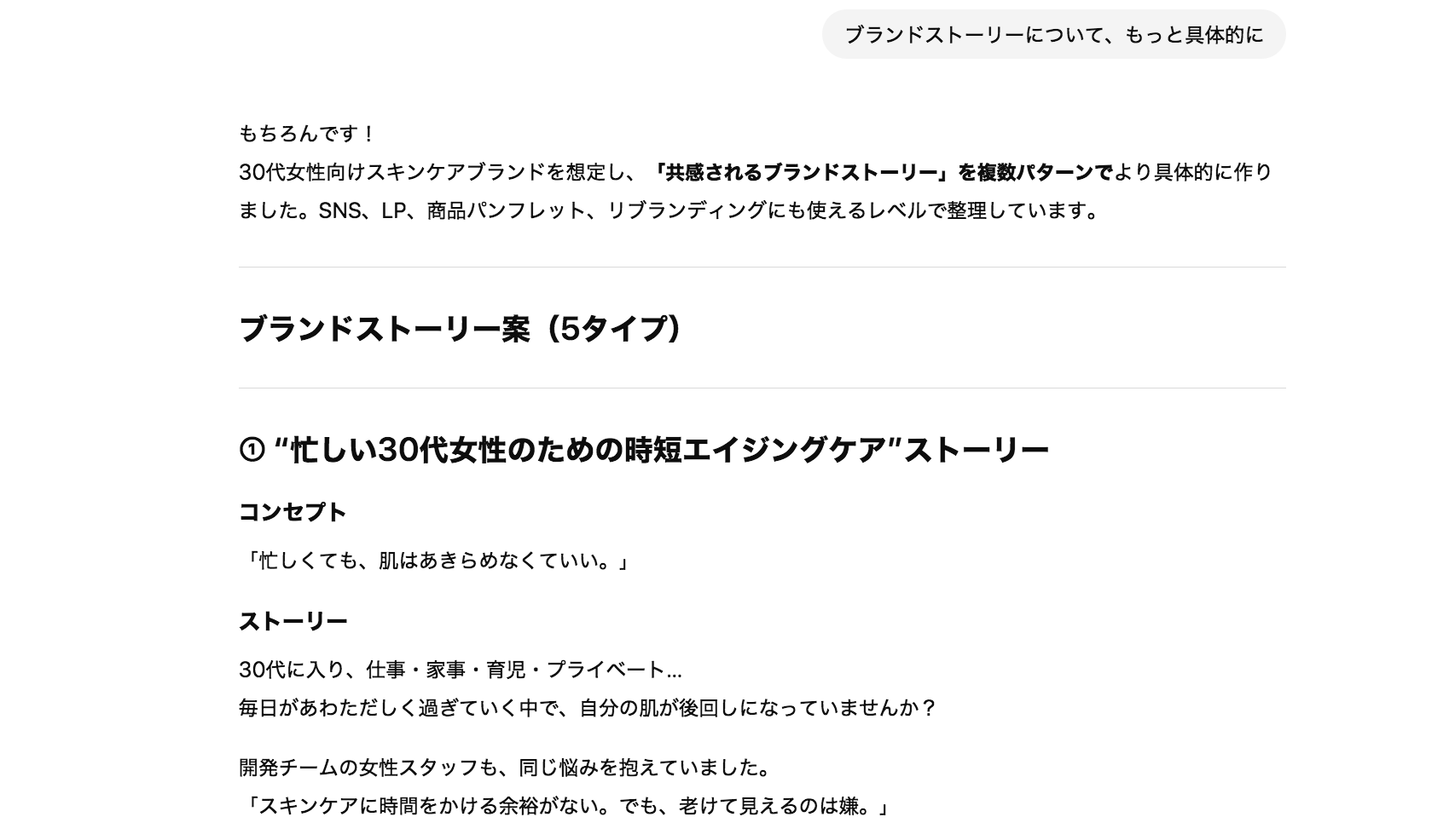 先ほどChatGPTに提案された「スキンケア用品のブランドストーリー」について、「より具体的に」とフィードバックをしてみました。