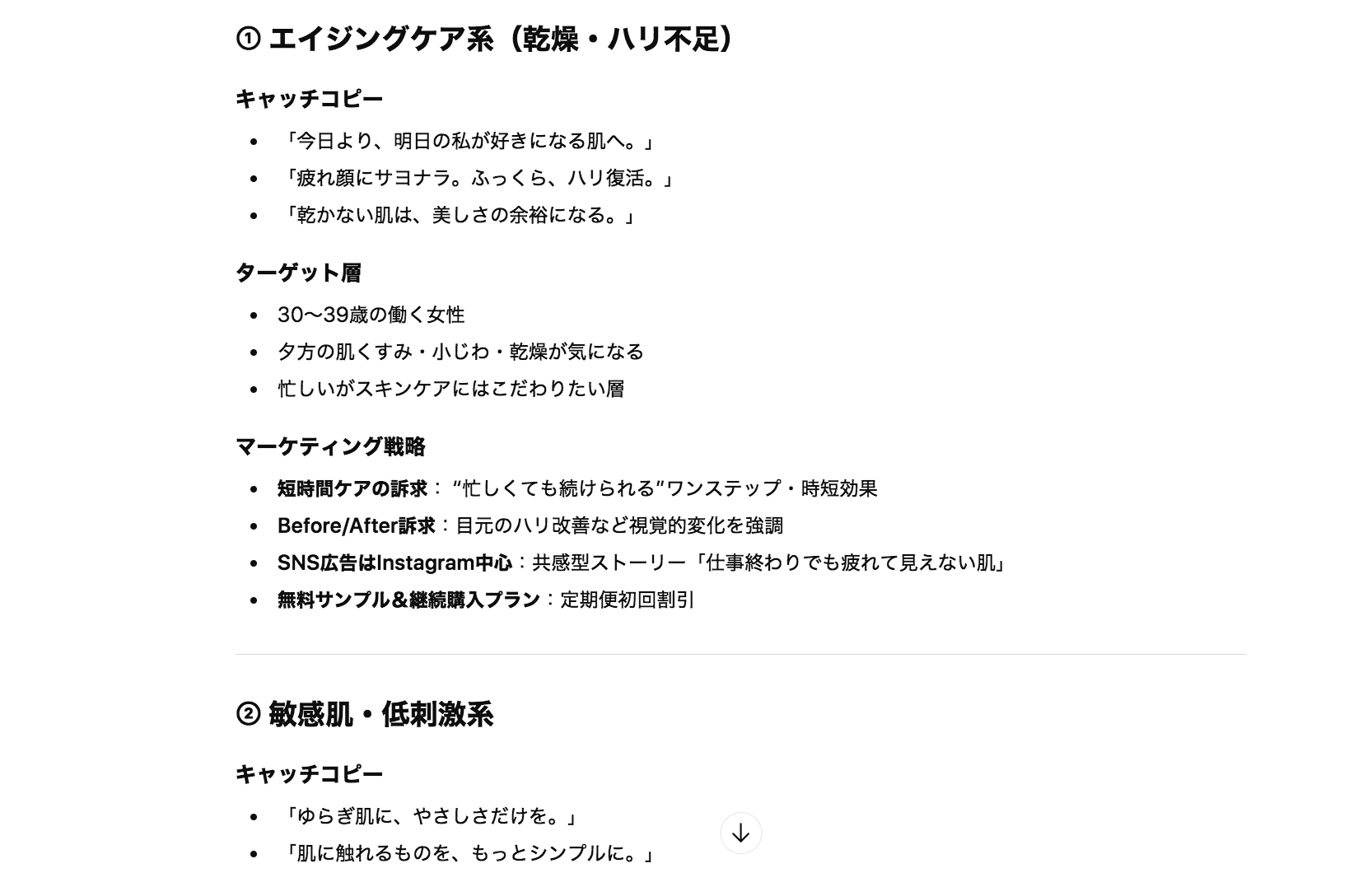 | 「スキンケア用品でよいアイデアない?」 | 「30代女性向けスキンケア用品のアイデアについて、 ・キャッチコピー ・ターゲット層 ・マーケティング戦略 をそれぞれまとめて提案して」 |
