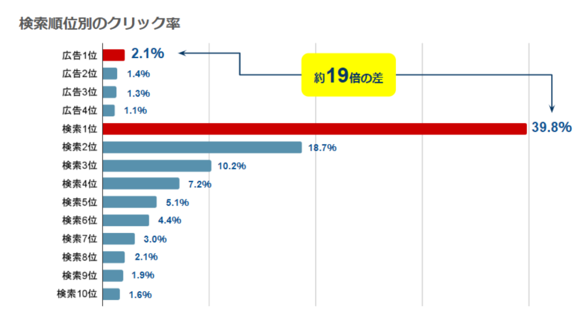 しかし「広告枠で上位表示した場合」と「SEO対策で上位表示した場合」では、ユーザーからの信頼度が大きく異なります。両者のクリック率の違いを見てみましょう。