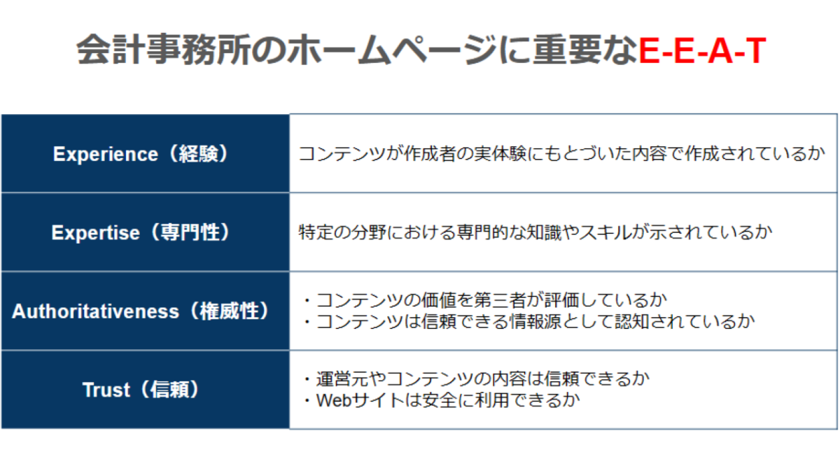 E-E-A-Tとは、Googleの検索品質評価ガイドラインで示されている、Webサイトとコンテンツの品質を評価する基準のことです。E-E-A-Tを考慮してサイトの品質を高めることは、結果的にSEOへいい影響を与えます。
