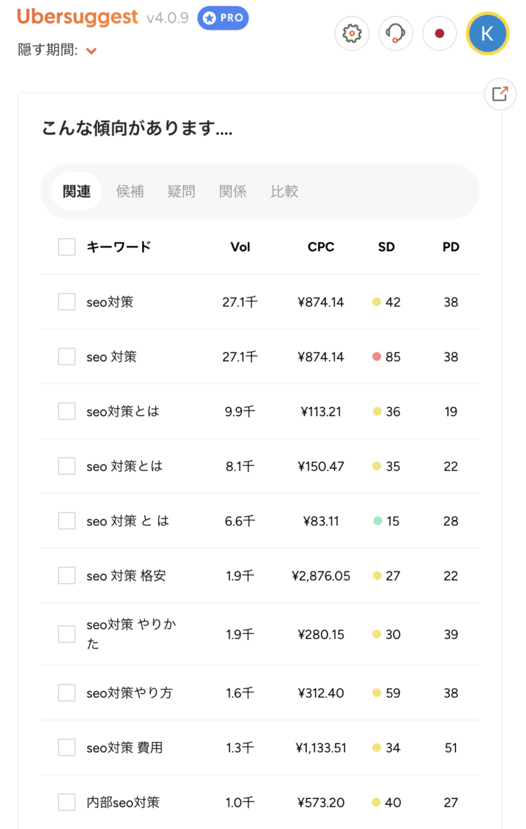 候補・疑問・関連・比較のタブをクリックするとUbersuggestの画面に移動し、それぞれに合致したキーワードが表示されますよ。
